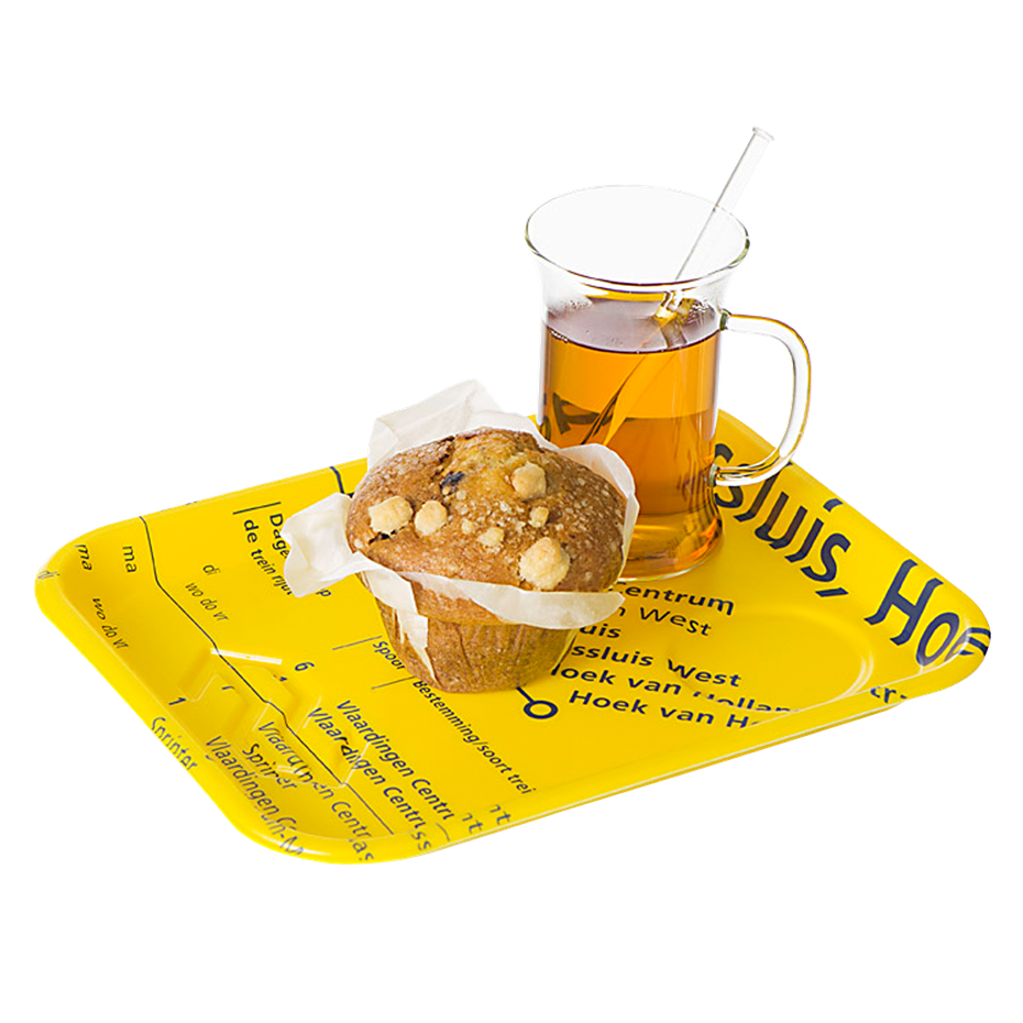 Dit unieke dienblad is gemaakt van gebruikte informatieborden van de NS. Studenten van de Hogeschool voor de Kunsten Utrecht wonnen met hun ontwerp een wedstrijd voor duurzaam hergebruik. Wil je op je dienstblad graag een specifieke bestemming terugzien? Geen probleem!