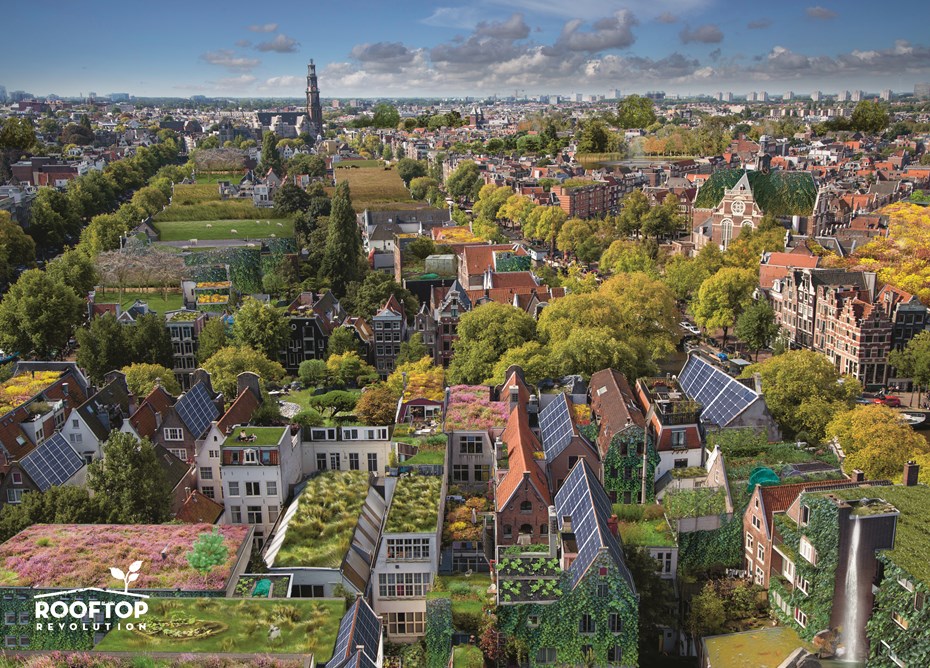 Met planten, bloemen en kruiden wil Rooftop Revolution de Nederlandse stadsdaken vergroenen. ‘Er is in steden een behoefte aan groen, maar ook een gebrek aan ruimte’, zegt directeur Jan Henk Tigelaar. ‘Op daken is nog wel plek. Dat biedt de mogelijkheid om uitdagingen als biodiversiteitsverlies en klimaatverandering aan te pakken.’ Groene daken trekken volgens Tigelaar insecten en vogels aan en zorgen voor verkoeling. Ook houden ze water vast en verfraaien ze het uitzicht. Er zijn al Rooftop Revolution-daken in Amsterdam, Rotterdam, Nijmegen en Den Haag. Kijk op rooftoprevolution.nl.